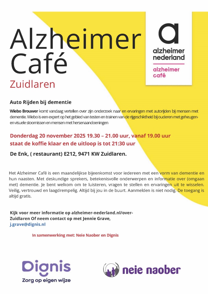 Dit Alzheimer Café word gehouden op donderdag 20 november tussen 19.30 – 21.00 uur in het restaurant van zorgcentrum De Enk in Zuidlaren. Aanmelden is niet nodig. De toegang is altijd gratis.