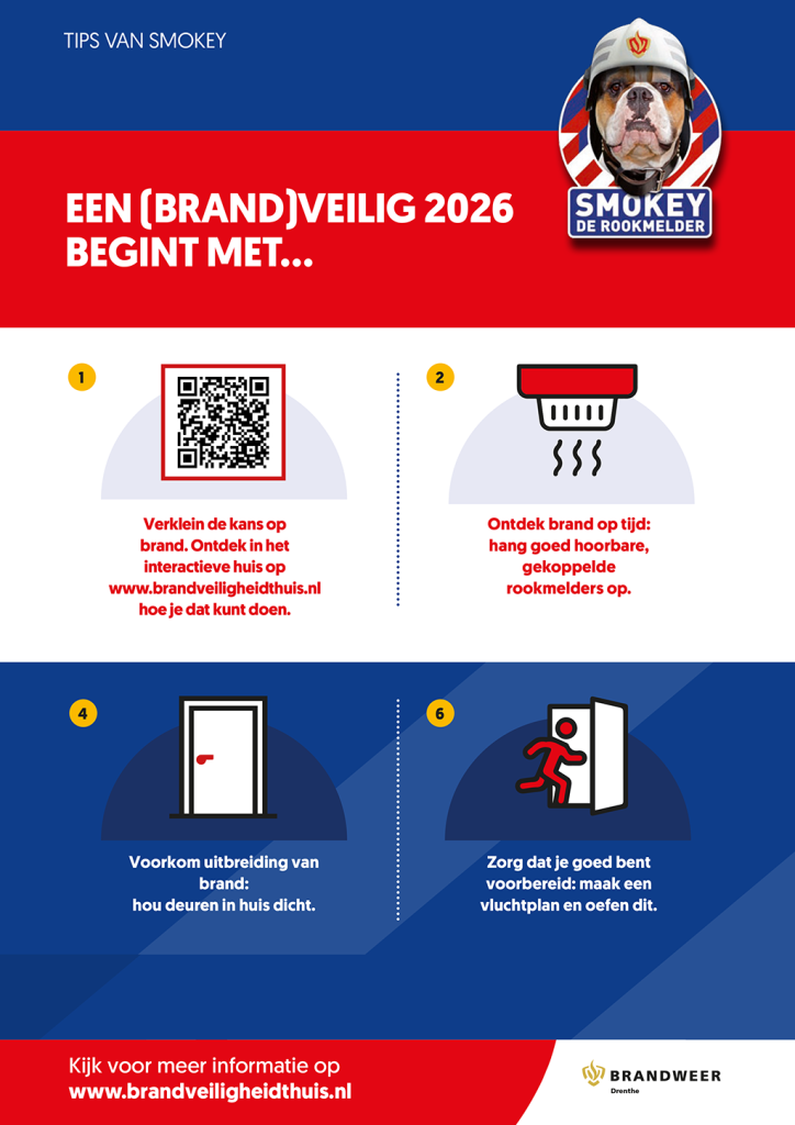 Smokey, de mascotte van de Brandweer Drenthe wens u een veilig 2026. Voor de tips die het voor u en ons veiliger maken in 2026 en natuurlijk ook daarna kunt u op de afbeelding hieronder klikken. Op naar een veilig 2026!