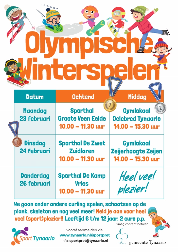 Maandag 23 februari tot en met 26 februari kun je curling, schaatsen en skeleton en nog veel meer! Meld je aan voor heel veel sport plezier! Leeftijd 6 t/m 12 jaar. 2 euro p.p. Aanmelden via www.tynaarlo.nl/sportpret