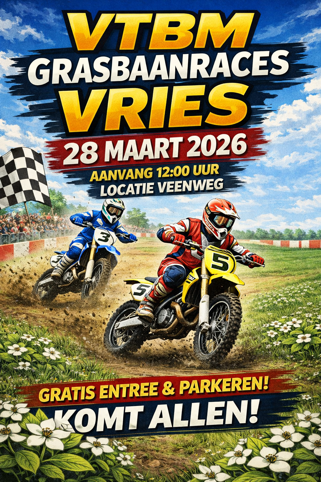 Komende zaterdag, 28 maart, zijn er aan de Veenweg in Vries weer grasbaanraces. Dit jaar is de organisatie in samenwerking met VTBM en zullen er in verschillende klassen crossmotoren de strijd aan gaan. De eerste races starten om 12.00 uur. Iedereen is van harte welkom om te komen kijken. Entree (en parkeren) zijn gratis!