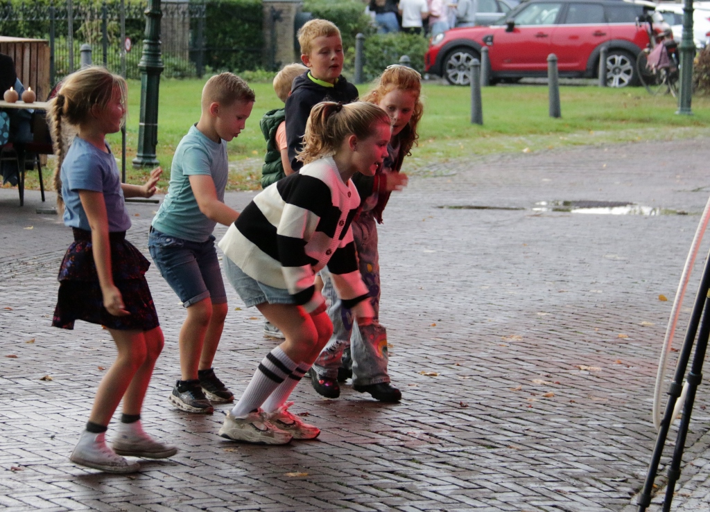 Langzamerhand kwamen er ondertussen meer mensen op de Brink, om zich op te maken voor de spectaculaire opening, verzorgd door Inge Evers. Met hoepels in verschillende kleuren verzorgde zij een fraaie openingsact, met een aantal kleurig verlichte hoepels. Het werd buiten al schemerig dus de kleuren kwamen daardoor extra mooi uit.