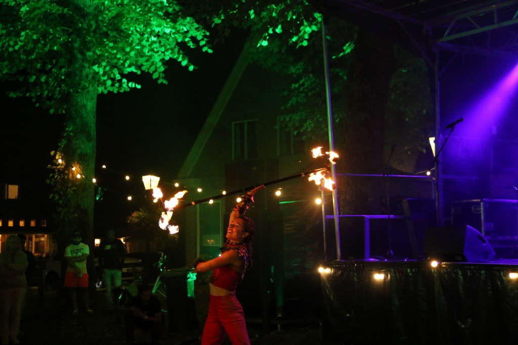 Ondertussen was er nog een spectaculair optreden op de straat met het nodige vuur, letterlijk en figuurlijk. Nu had Inge Evers allerlei brandende attributen waarmee zij jongleerde. Wie dichtbij stond kon op den duur de warmte voelen van al dat vuur.