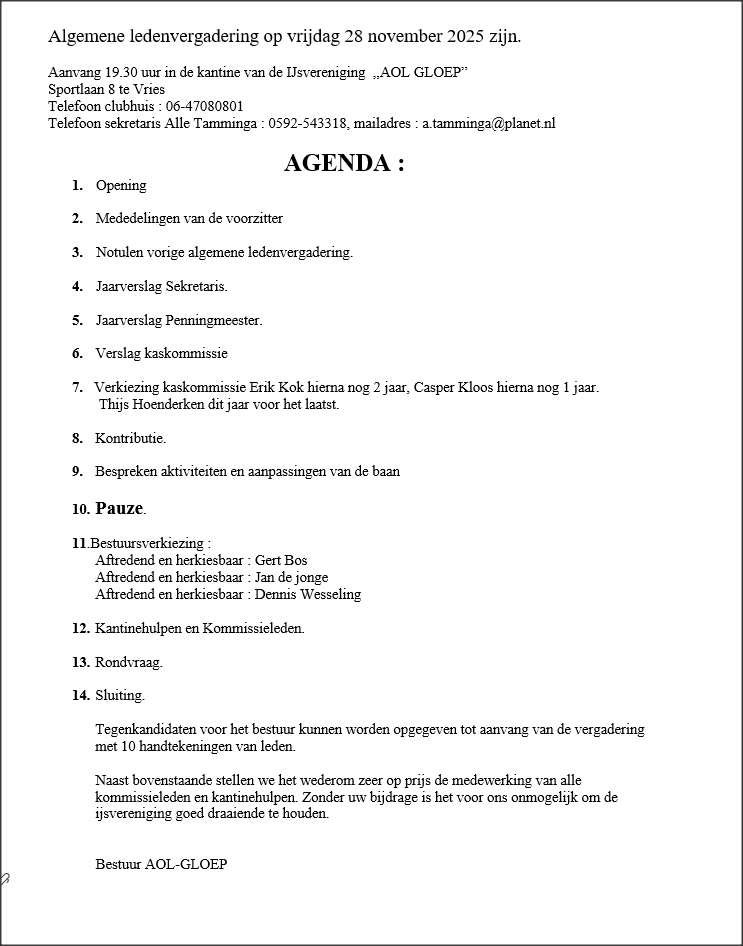 Wij, als bestuur van IJsclub Aol Gloep, houden de algemene ledenvergadering op vrijdag 28 november 2025, aanvang 19.30 uur in ons clubhuis aan de sportlaan.