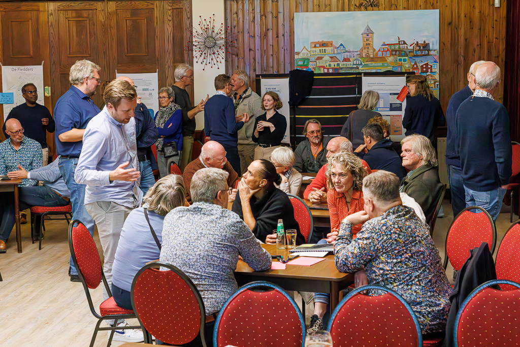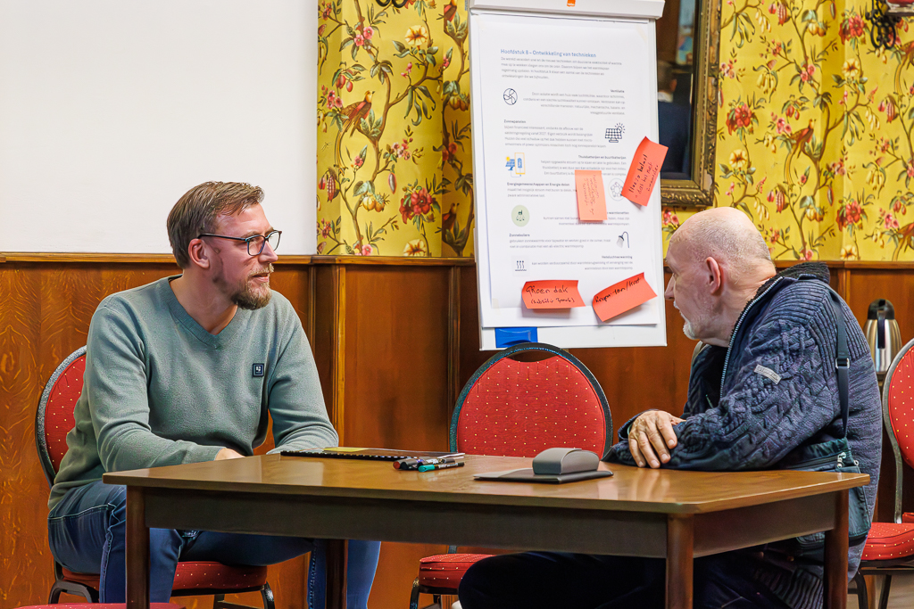 Vervolgens gingen we de spreekwoordelijke diepte in. Het projectteam, vertegenwoordigende Buurtteam De Fledders en de gemeente Tynaarlo, had items uit het concept warmteplan op grote vellen papier aangebracht. Deze hingen her en der in de Grote zaal. De aanwezigen werd gevraagd over de inhoud in gesprek te gaan en op- en aanmerkingen hierop met behulp van plakvellen aan te brengen.