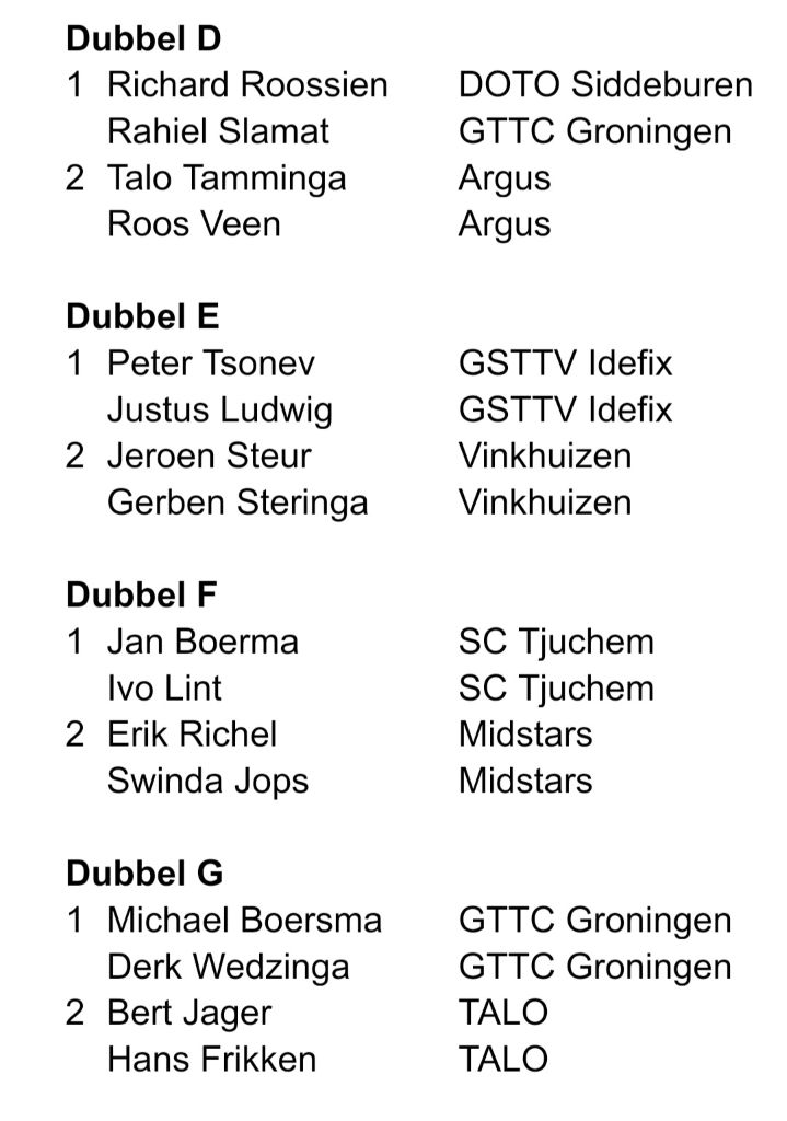 Ondanks het wegvallen van twee speeldagen kwamen 111 fanatieke deelnemers in actie op 24 tafels. Er werd gestreden om de felbegeerde GK-titels in zowel enkel- als dubbelspel. Grote winnaars in de hoogste categorie waren Rahiel Slamat (GTTC Groningen) en Richard Roossien (DOTO Siddeburen) bij het dubbelspel. In het enkelspel kroonde Baraa Hashem (DOTO Siddeburen) zich tot Groninger Kampioen.