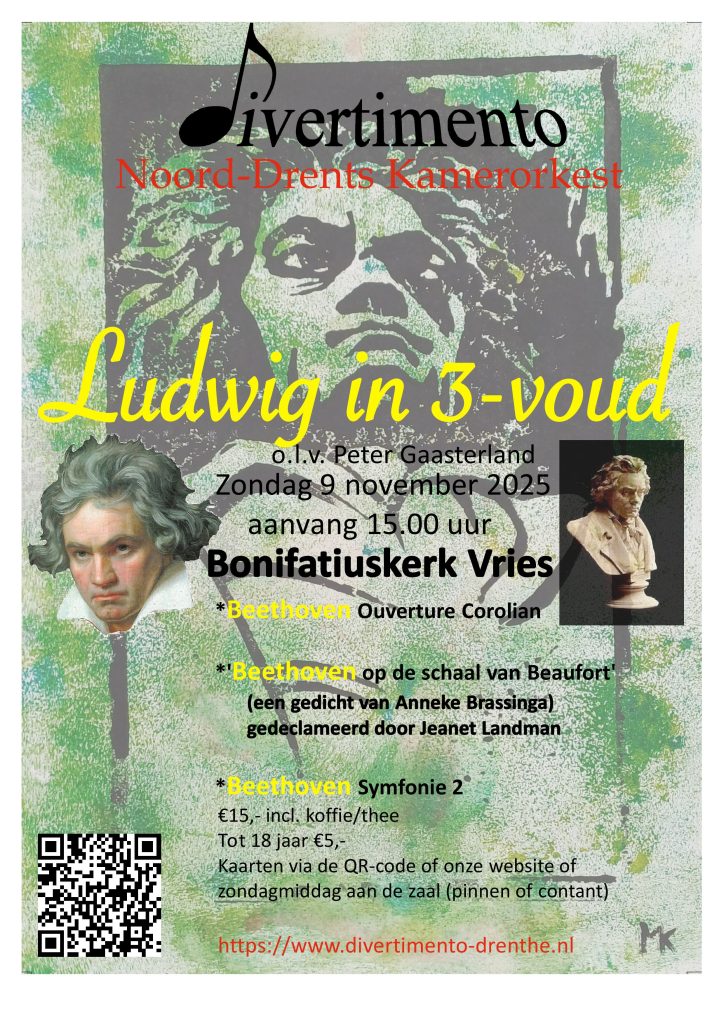 Op 9 november a.s. geeft amateurorkest Divertimento uit Assen een Beethovenconcert in de Bonifatiuskerk in Vries.