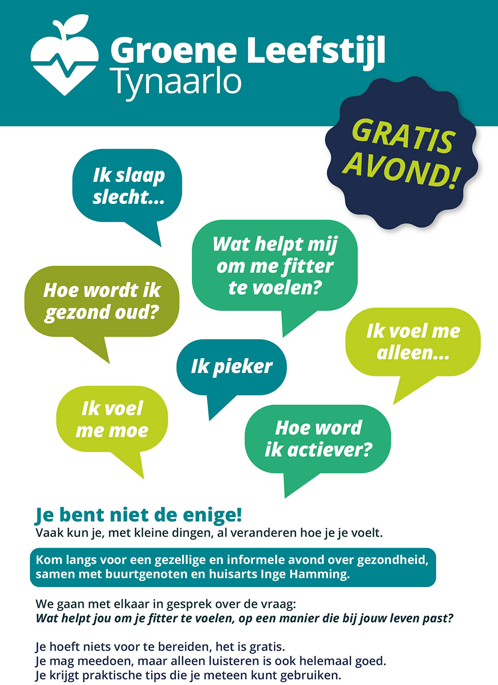 Volgens huisarts Inge Hamming, een van de initiatiefnemers, kan het helpen om hierover met anderen in gesprek te gaan en aandacht te hebben voor kleine, haalbare veranderingen in je dagelijkse leven. “Niet alles is op te lossen in de spreekkamer, of met een pil,” zegt zij. “Voor veel mensen helpt het om iets te veranderen in hun leefstijl, waardoor klachten kunnen verdwijnen of verminderen, ook als ze ziek zijn. Veel mensen weten alleen niet hoe ze dat aanpakken. Tijdens deze avonden laten we zien wat werkt, krijg je praktische handvatten en ga je, in je eigen tempo, concreet aan de slag met je leefstijl. Ook horen we graag wat mensen nodig hebben om stappen te zetten, zodat we de zorg in onze gemeente beter kunnen laten aansluiten.”