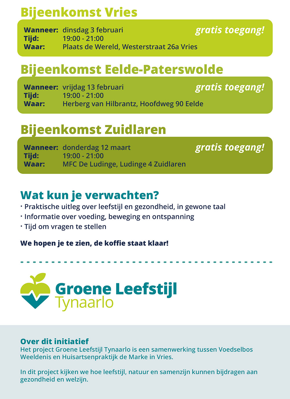 De bijeenkomsten zijn gratis en bedoeld voor alle inwoners van Tynaarlo, met of zonder gezondheidsklachten. Er is koffie, thee en iets lekkers. Aanmelden is niet nodig; binnenlopen kan gewoon. Je hoeft niets voor te bereiden. Je bent ook welkom om samen te komen, bijvoorbeeld met een buur, partner of familielid.