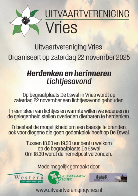 Op begraafplaats De Eswal in Vries wordt op 22 november een lichtjesavond gehouden. In een sfeer van lichtjes en warmte willen we iedereen in de gelegenheid stellen overleden dierbaren te herdenken.