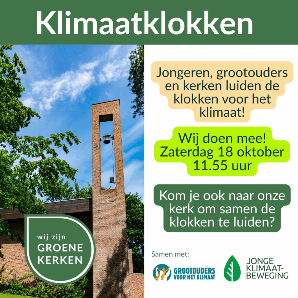 Het luiden van de Klimaatklokken is een krachtig, historisch signaal van saamhorigheid en urgentie. De klimaatcrisis raakt iedereen en vraagt om zichtbare, gezamenlijke actie. Door samen de Klimaatklokken te luiden, laten we zien dat we niet langer kunnen wachten: het is letterlijk en figuurlijk vijf voor twaalf. We brengen generaties en gemeenschappen samen, maken duidelijk dat het klimaat iedereen aangaat, en roepen de politiek op om verantwoordelijkheid te nemen en moedige keuzes te maken. De klok tikt: het is tijd om in actie te komen voor het klimaat!