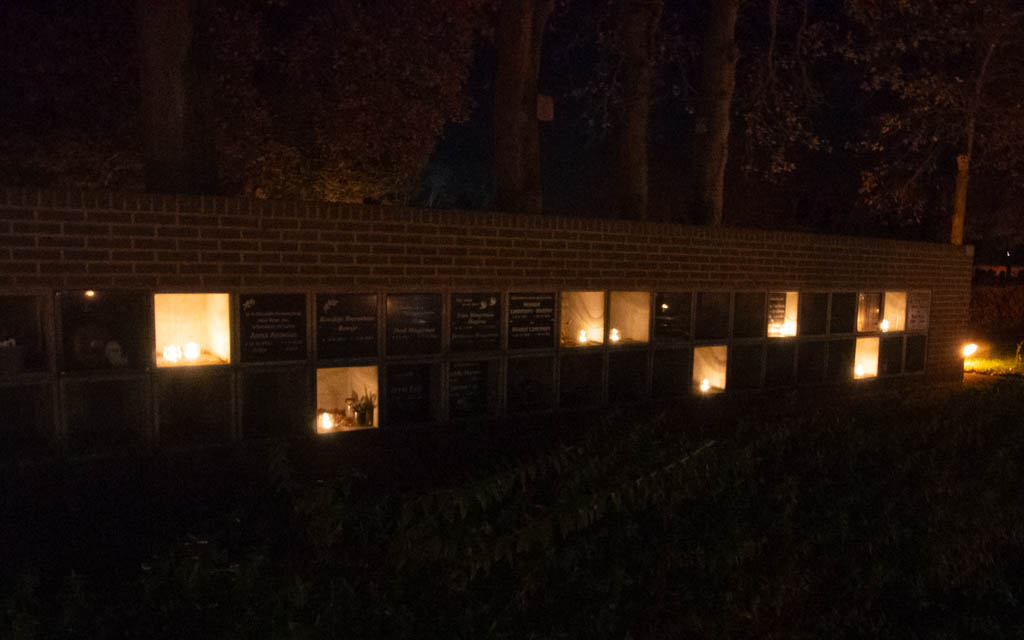 Het was een komen en gaan van mensen die een kaarsje kwamen branden voor een dierbare of uit interesse kwamen om het prachtige beeld van de begraafplaats te bewonderen. Om weer op te warmen was er voor iedereen in de aula een kop koffie of thee.