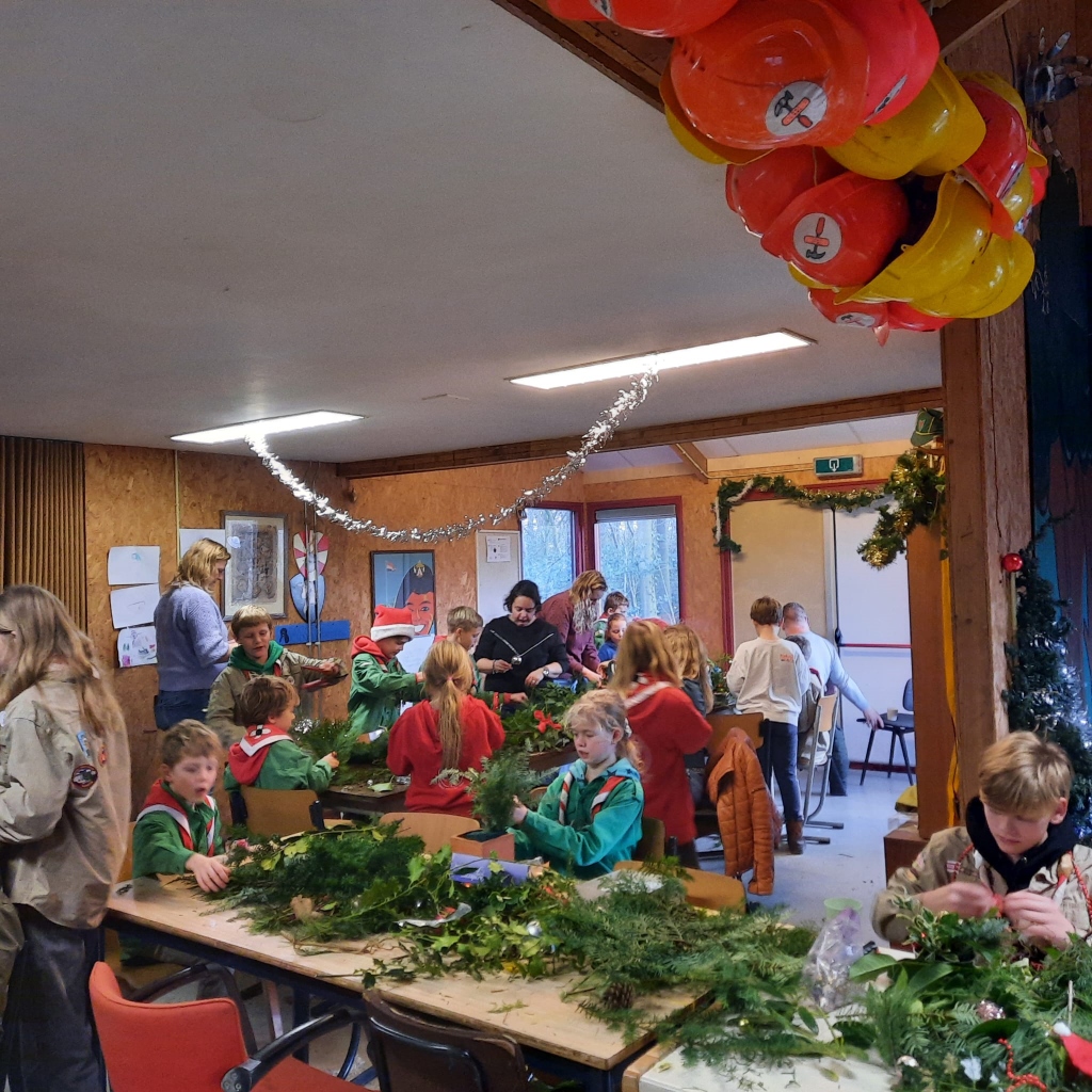 Deze ochtend waren weer veel leden naar het clubgebouw van Scouting Vries aan de Sportlaan gekomen. Samen met broers en zussen en met wat hulp van enkele ouders werd veel energie gestoken in het maken van een leuk kerststukje. Kleine, bonte, grote en verlichte stukjes, een ieder kon zijn eigen creativiteit in het kerstontwerp leggen. Het resultaat was ruim 50 met veel inzet gemaakte kerststukjes.