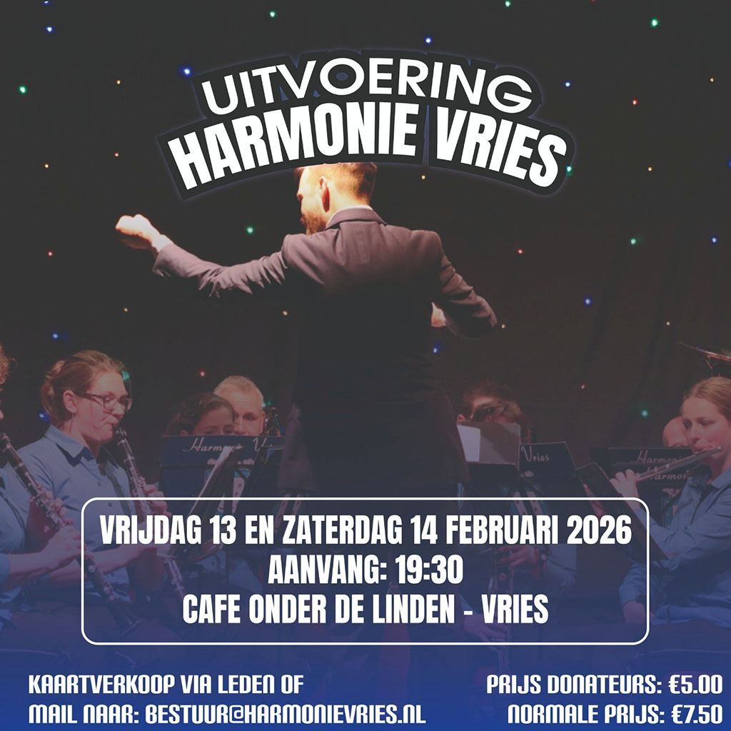 Harmonie Vries pakt uit met een sprankelende en sportieve uitvoering op vrijdag 13 februari en zaterdag 14 februari. Beide avonden beginnen om 19.30 uur en vinden plaats in Grand Café Onder de Linden in Vries. Het belooft een avond vol energie, muziek en verrassingen te worden.