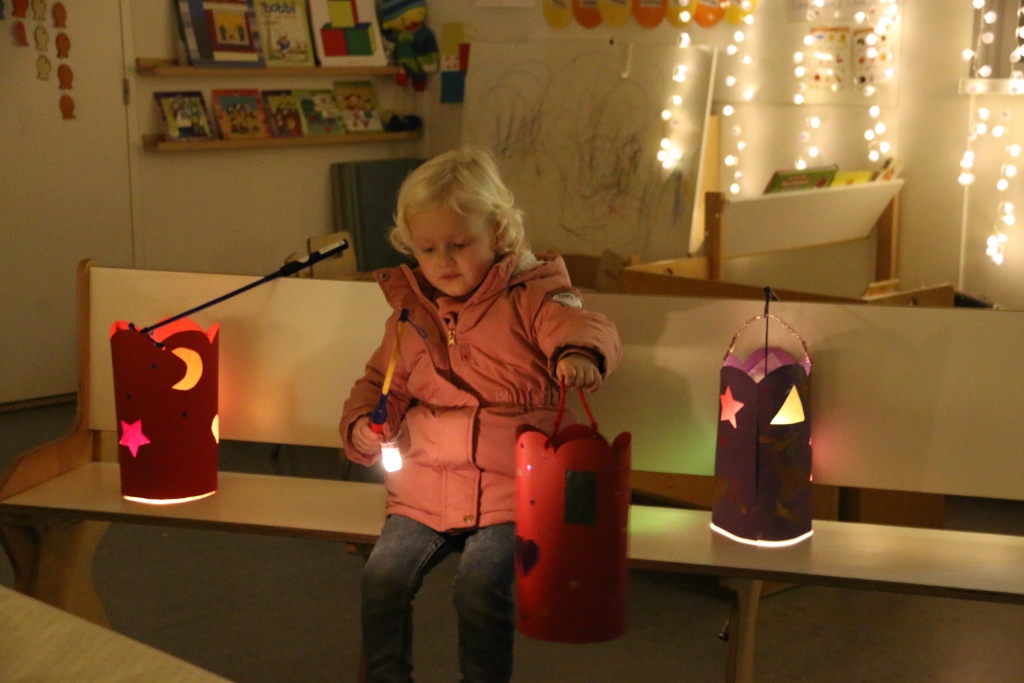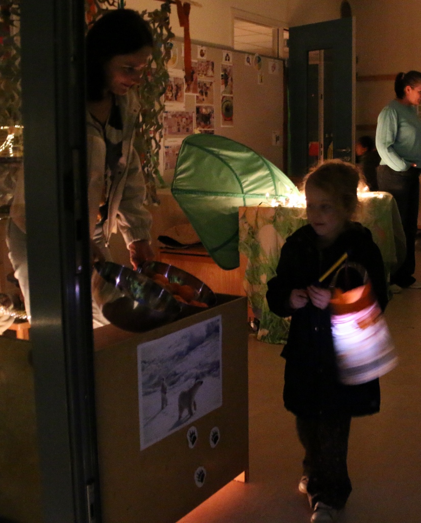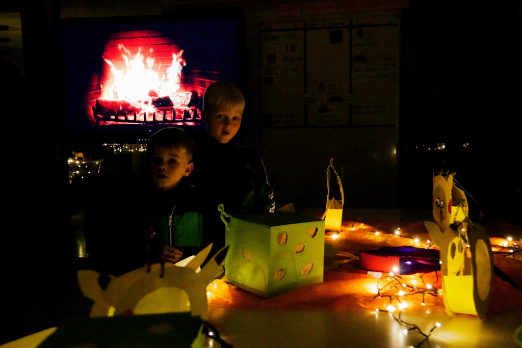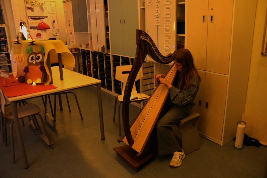 Terwijl het buiten al begon te schemeren werd het binnen mooi verlicht door de kinderen hun lampions. Om de sfeer in de school compleet te maken was in sommige lokalen de ‘knapperige openhaard’ aan en in een ander zelfs live muziek te horen. Als achtergrond en sfeermaker speelde daar een harpist.