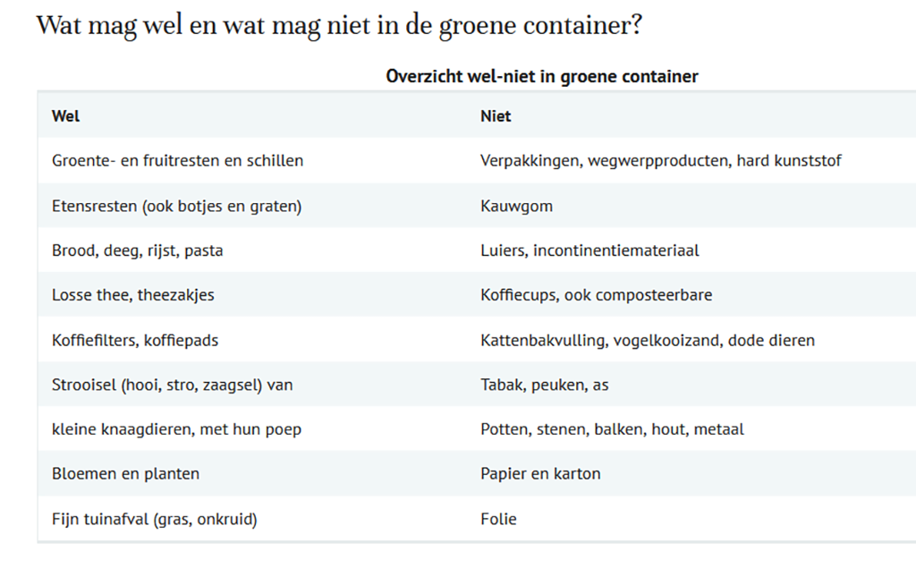 Op onderstaande afbeelding is te zien wat wel en wat niet in de gft container mag.